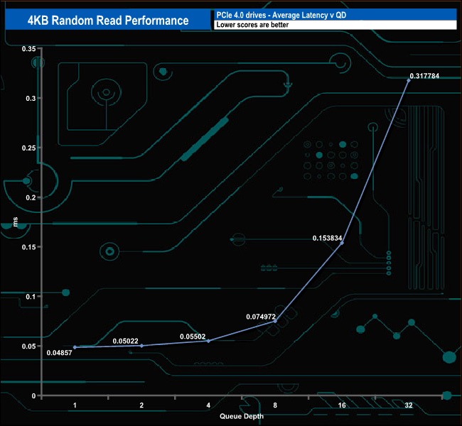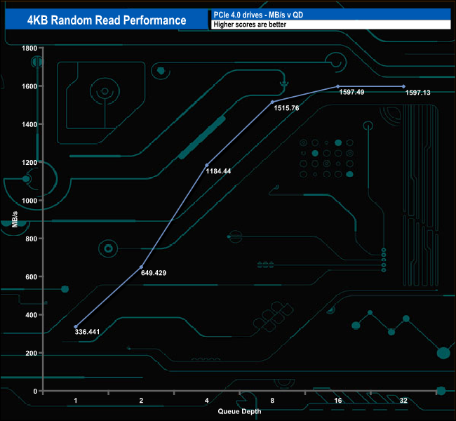 We used CrystalDiskMark 8‘s custom settings to test the 4K random read performance of the drive through a range of queue depths. The setup for the tests is listed below.