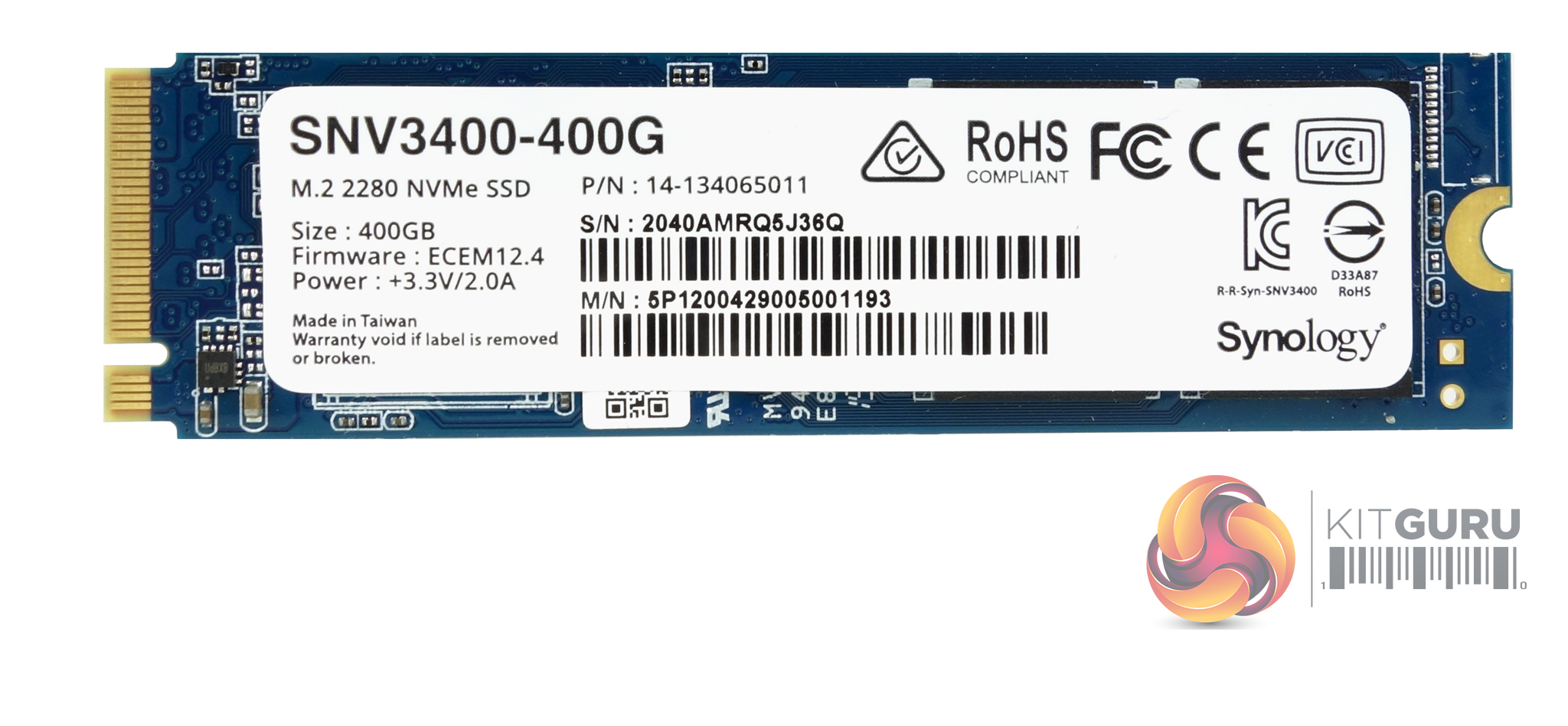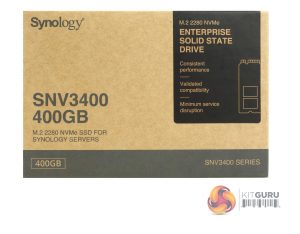 Synology's SNV3400-400G comes in a compact box, free of any images of the drive, not surprising as the drive is labelled as an enterprise drive. On the right-hand side of the box front is a panel with three bullet points about the drive; Consistent performance, validated compatibility and minimum service disruption.