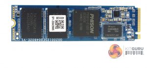 The SNV3400-400G is built on a dual-sided M.2 2280 format. One side of the PCB houses the Phison PS5012-E12DC controller, two 128GB packages of Kioxia BiCS3 64-layer TLC NAND (coded TA7AG55A IV) and a single 4GB DDR4 (SK Hynix H5AN4G8NBJR) cache IC. The other side of the PCB just houses two more NAND packages.