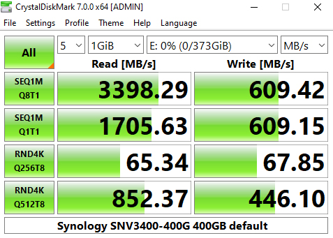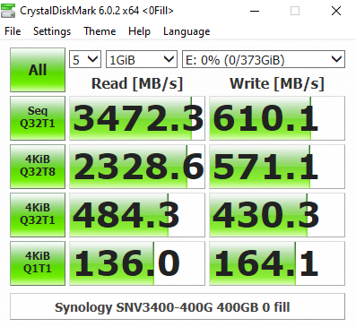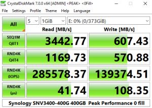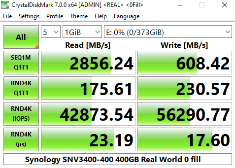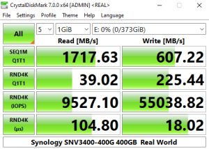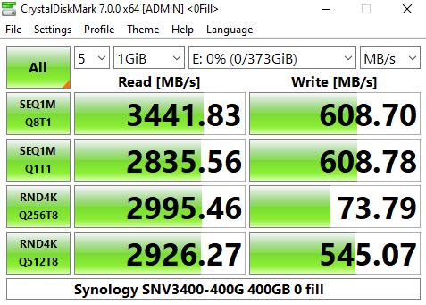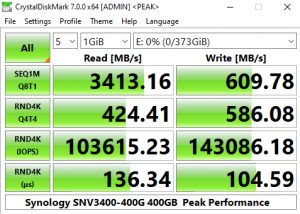 Synology's SNV3400-400G's performance in CrystalDiskMark’s deeper queue depth 4K test leaves it the bottom half of the results chart. From looking at the two benchmark result screens, it seems that the controller has a preference for handling compressible data. Using this type of data sees a big boost in the random read performance at queue depths 1 (1 thread) and 32 (8 threads).