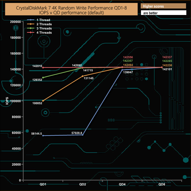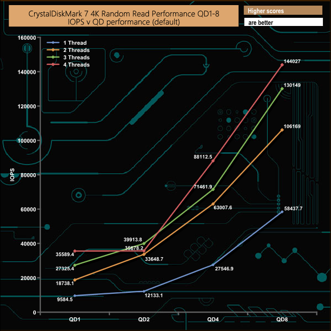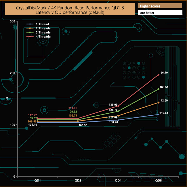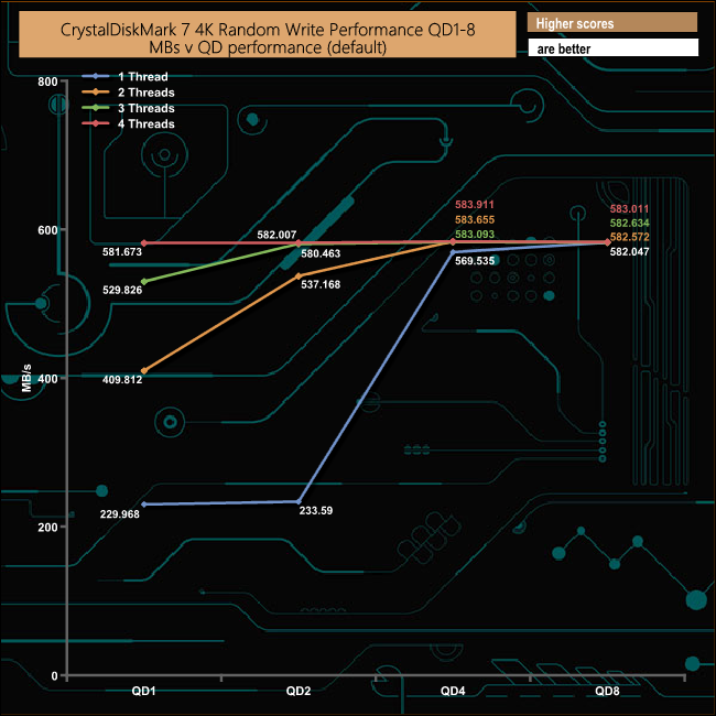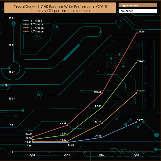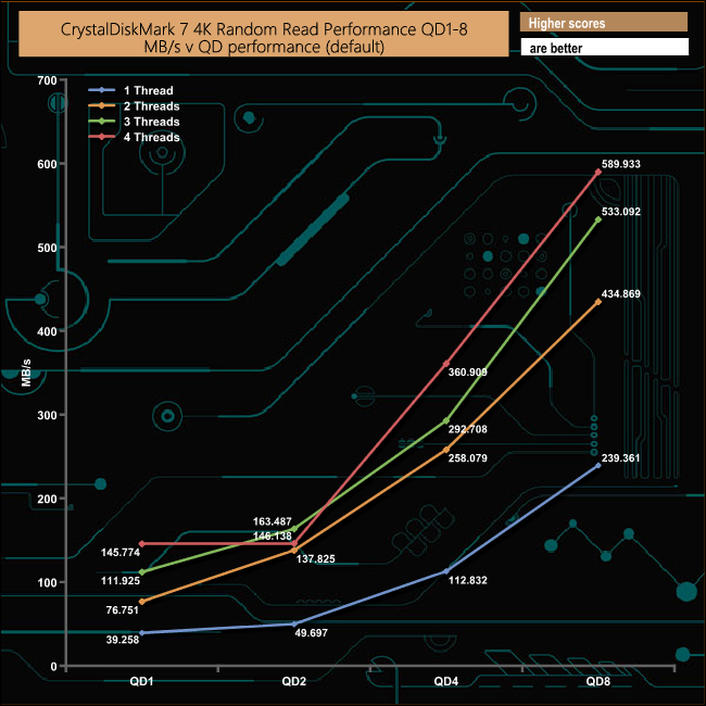 We also used CrystalDiskMark 7 to test the drive at lower queue depths (where most of the everyday workloads occur) using 1 to 4 threads. The random read performance climbs smoothly through each of the tested queue depths apart from the 4-threaded test when the performance dips a little at QD2 before recovering and carrying on climbing through the remaining queue depths.
