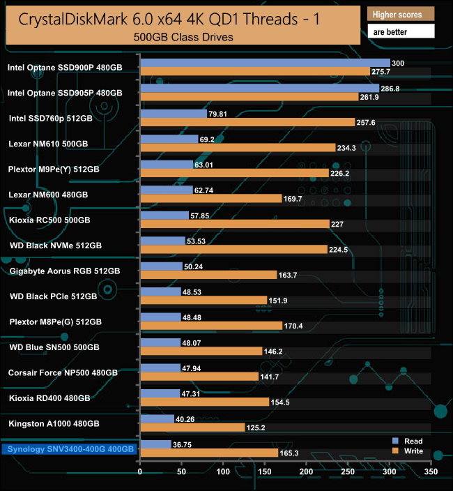In the QD1 test, the read performance of the drive leaves it at the bottom of the result charts. However, its write performance at this queue depth is much better than its read.