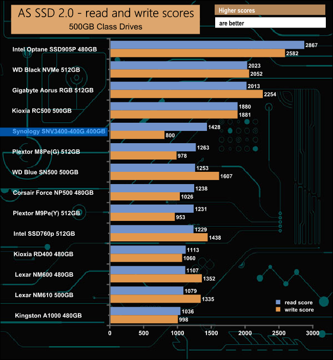 Although designed as a cache drive, when tested with the AS-SSD benchmark the SNV3400-400G's read score of 1428 was good enough to fill the 5th slot in our results chart for 400GB-500GB class drives.