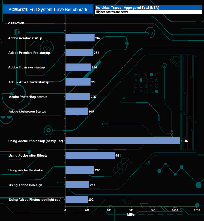 The drive averaged 236MB/s for the six Adobe startup tests in PCMark10 and 436MB/s for the five using Adobe test traces. The best score in this range of tests was the 1,046MB/s for the Adobe Photoshop (heavy use) trace.