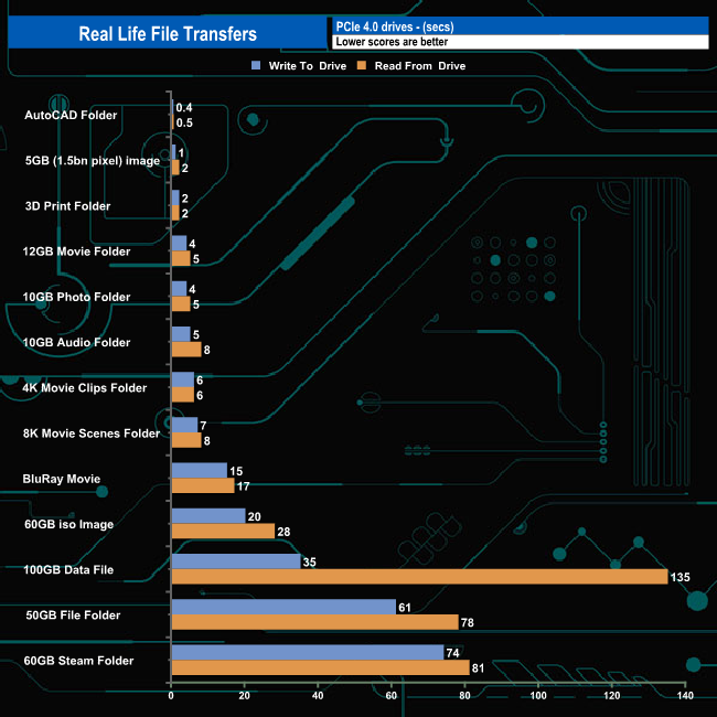 Swapping over to an all NVMe architecture saw, as you might expect transfer speeds rocket, with ten out of the thirteen write transfers topping well above 2.5GB/s. The faster write transfer was for the 5GB data file at 2,948MB/s, the slowest being the 60GB Steam folder transfer. Reading the data back the drive topped the 2GB/s mark on nine out of the thirteen tests with the 2.5GB/s mark passed five times.