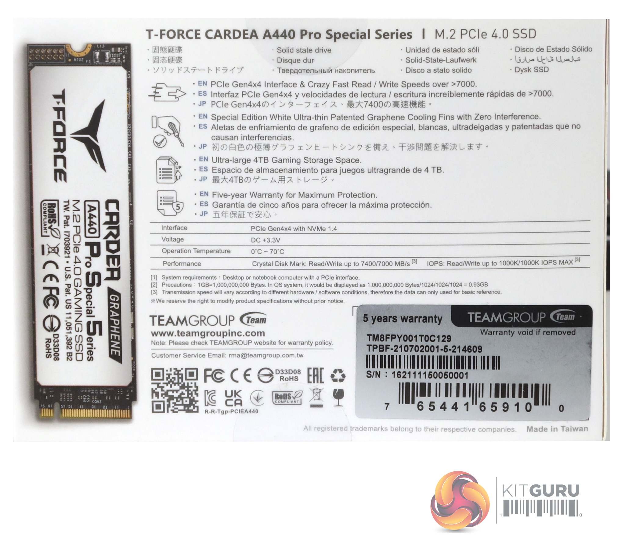 The rear of the box carries another image (this time life-size). To the right of the image is a small multilingual information panel under which is a small list of some of the drives features. To aid in cooling the drive, Teamgroup supplies a very thin Graphene heatsink bundled in the box.