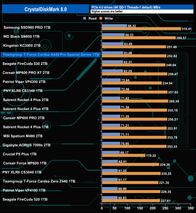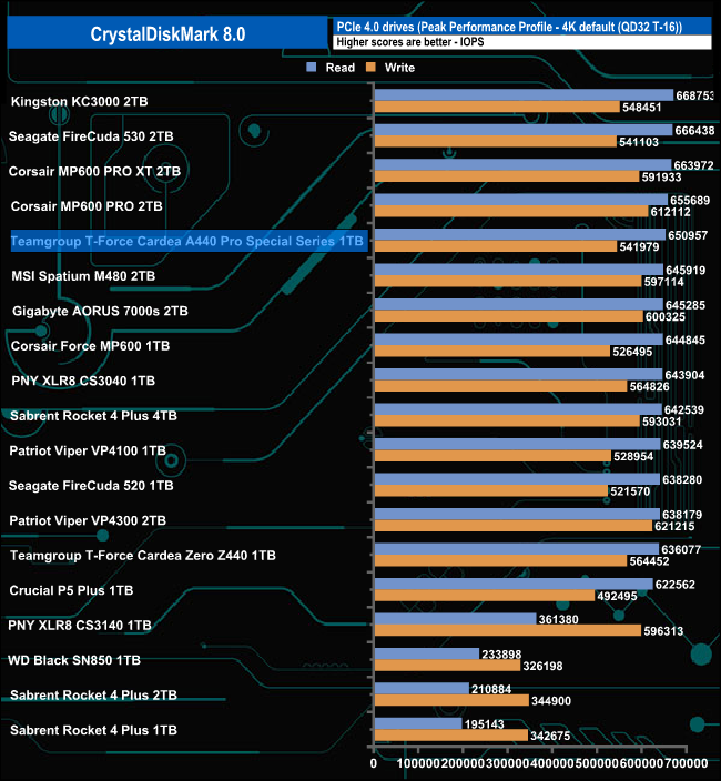 Looking at all the CrystalDiskMark results screens we can see that the Phison E18 controller that the A440 Pro Special Series uses is much more efficient when reading compressible 4K data at lower queue depths.