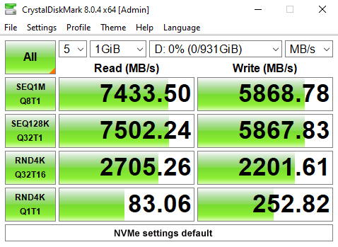 Teamgroup quotes Sequential read/write figures for the drive as up to 7,200MB/s and 6,000MB/s respectively. Using the default CrystalDiskMark 8 test we could confirm the official read figure with a result of 7,433MB/s. As for writes, the test result of 5,868MB/s is just a wee bit shy of the official maximum figure.