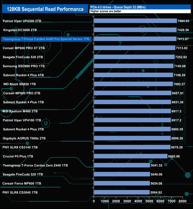 At QDs 1 and 2 the drive sits near the bottom of the results chart. However, by QD4 it has rocketed up the chart until at QD32 it sits in third place behind the Patriot Viper VP4300 and Kingston's KC3000 drives.