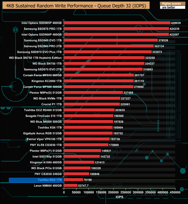 When tested with our 4K random write tests using 4 threads, the results we got from the drive were disappointing to say the least. The best figure we got was 77,132 IOPS, nowhere close to the official maximum figure of 200,000 IOPS.