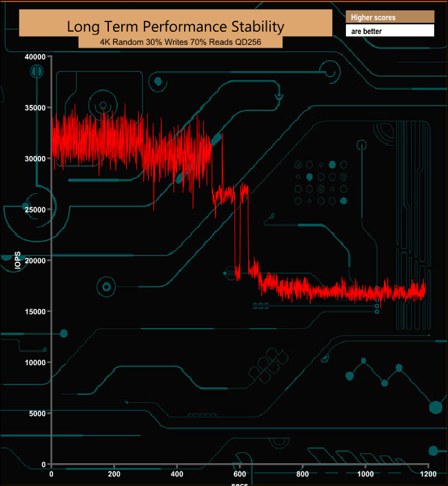 For the long term performance stability test, we set the drive up to run a 20-minute 4K random test with a 30% write, 70% read split, at a Queue Depth of 256 over the entire disk. The 1TB Toshiba BG4 averaged 23,935 IOPS for the test with a performance stability of 70%.