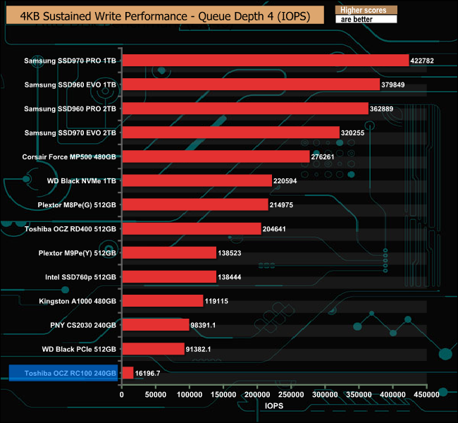 Throughout the queue depth range, our RC100 really struggled with the 4K random write tests as can be seen by the very low IOPS scores.