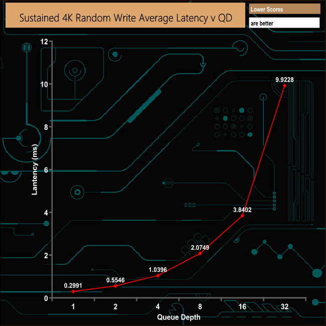 Most desktop operations happen in the 1 – 4 queue depth range, so we’ve broken out the test results to see how the drive performs at these queue depths in comparison with other drives, as well as at a queue depth of 32 – although in the desktop environment you’ll seldom, if ever, see a queue depth that high.