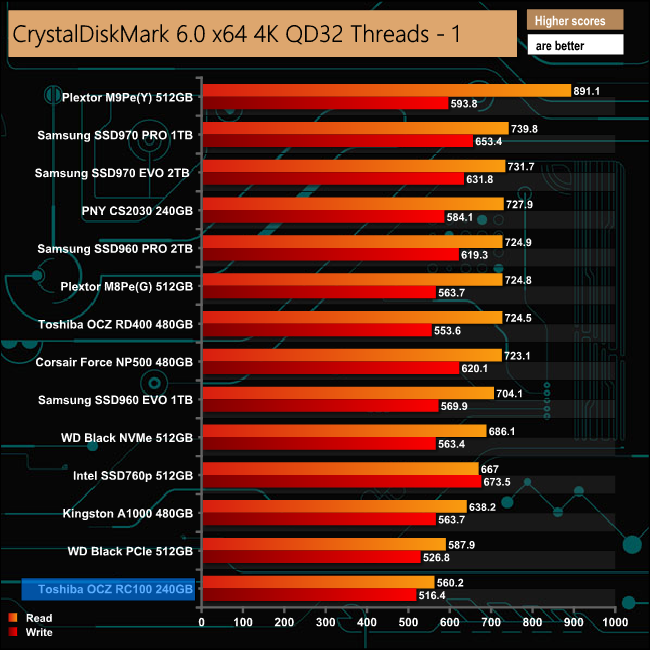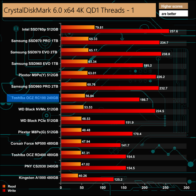 At a Queue Depth of 32 the RC100 sits in last place in our list of CrystalDiskMark tested NVMe drives. However, shallowing the QD to 1 sees the drive move several places up to graph with a slightly better 4K random read figure than WD's Black NVMe drive, although the WD drive has a better write number. It's a wee bit faster than the more elderly Toshiba OCZ RD400 even with that drive using MLC memory.