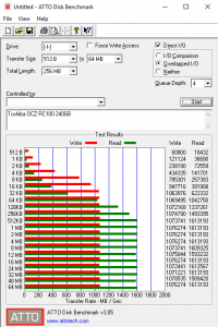The official sequential read/write figures for the 240GB RC100 are up to 1,600MB/s for reads and up to 1,050MB/s for writes, both figures we could confirm with the ATTO benchmark.