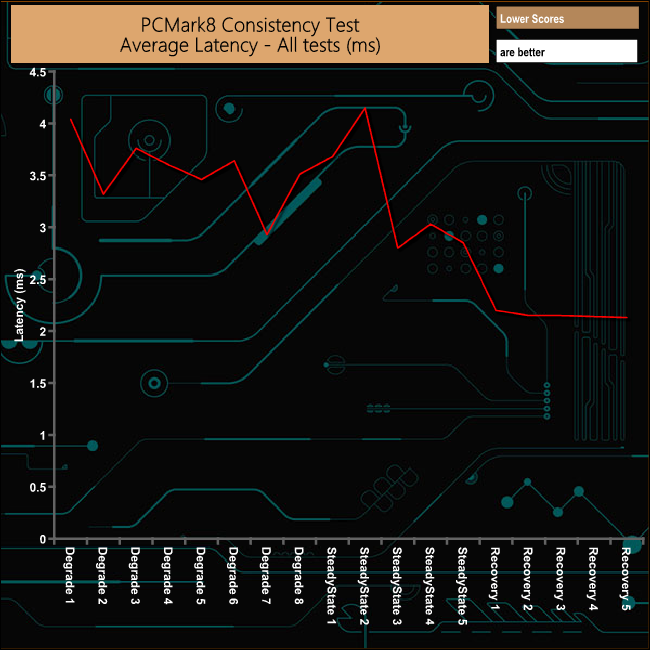 Futuremark’s PCMark 8 is a very good all-round system benchmark but it’s Storage Consistency Test takes it to whole new level when testing SSD drives. It runs through four phases; Preconditioning, Degradation, Steady State, Recovery and finally Clean Up. During the Degradation, Steady State and Recovery phases it runs performance tests using the 10 software programs that form the backbone of PCMark 8; Adobe After Effects, Illustrator, InDesign, Photoshop Heavy and Photoshop Light, Microsoft Excel, PowerPoint, Word, Battlefield 3 and World of Warcraft. With some 18 phases of testing, this test can take many hours to run.