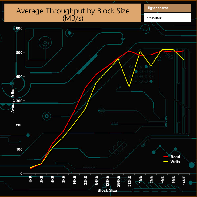 The drives read performance was less erratic than the writes in the throughput test peaking at 506.41MB/s. Although the writes peaked at a higher rate at 512MB/s the performance dropped twice, once at the 512KB block size and again at the 2MB block size but it recovered well from both drops.