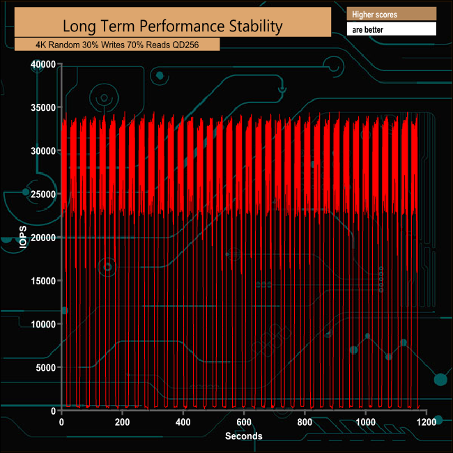 For the long term performance stability test, we set the drive up to run a 20-minute 4K random test with a 30% write, 70% read split, at a Queue Depth of 256 over the entire disk. The Toshiba TR200 960GB drive averaged 33,953 IOPS for the test with a performance stability of 53.14%, which for a drive in this market segment is pretty good.