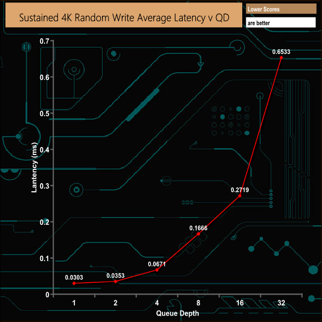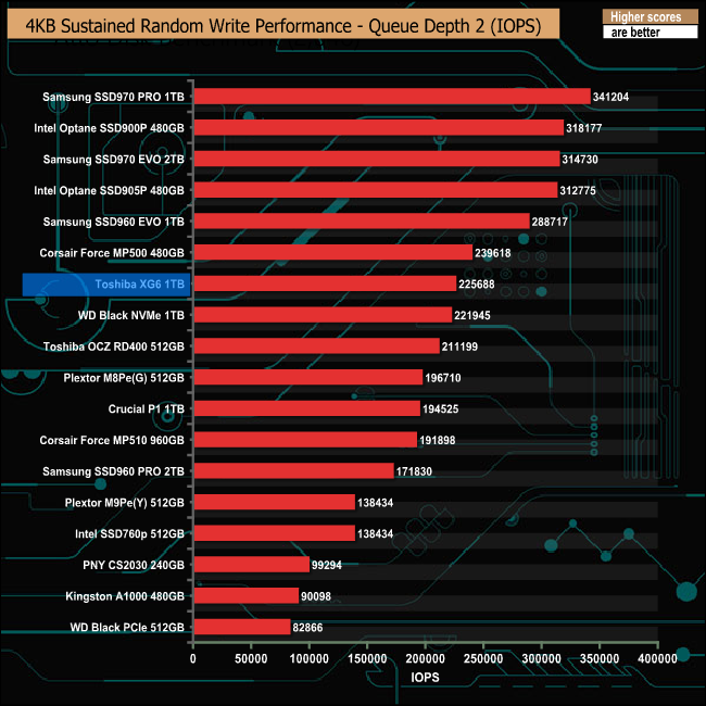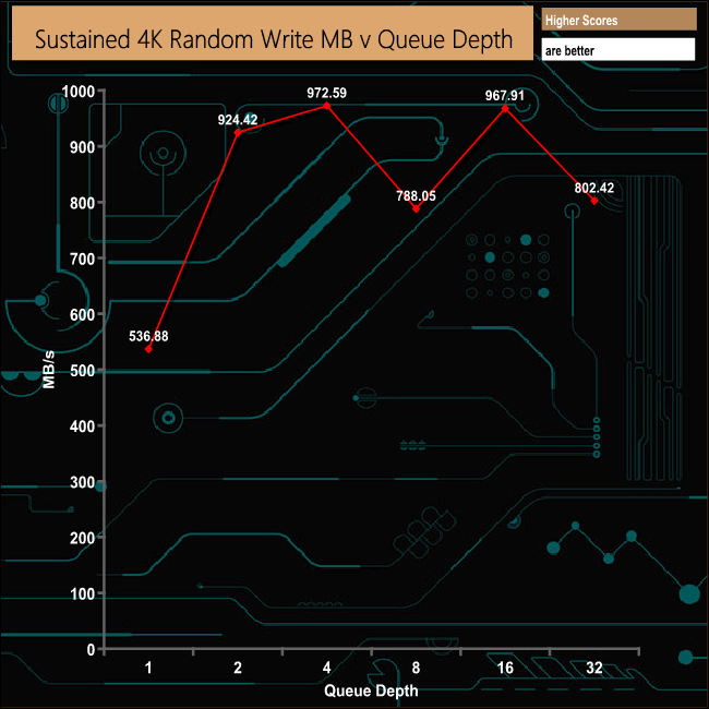 The random write performance of the drive improves in queue depths 2 and 4 compared to the relatively low IOPS figures at QD1 and QD32.