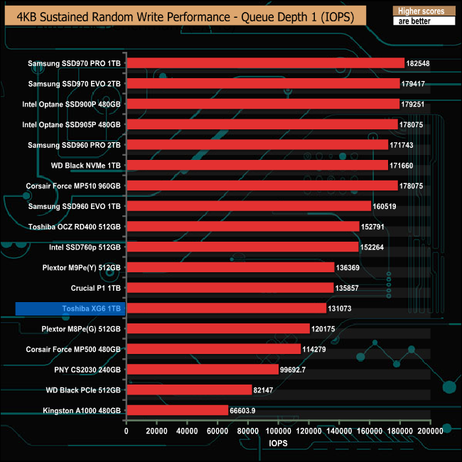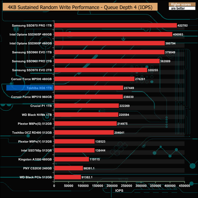 Under our 4K random write tests, the XG6 displays a real drop in performance at queue depths 8 and 32. The maximum IOPS figure we got from the drive was 237,449 IOPS which is a fair way off the official figure of 365,000 IOPS.