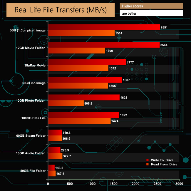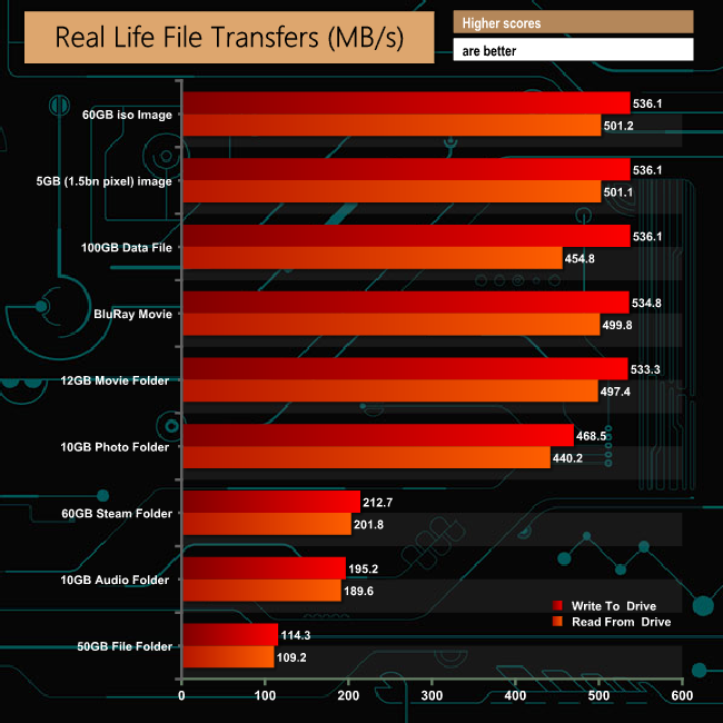 The XG6 deals with the large file sizes in our real life file transfer tests very efficiently, much more so than the small files that make up the 50GB file, 60GB Steam and 10GB Audio folder transfers.