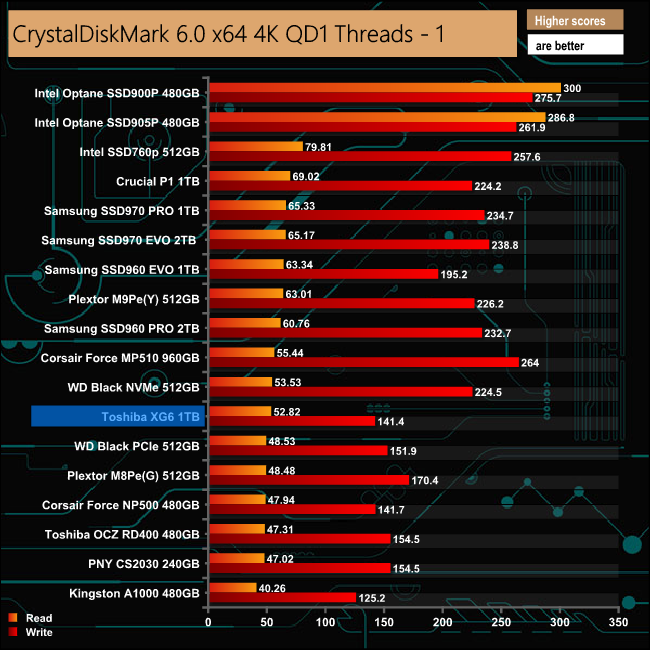 When tested at a queue depth of 32 using CrystalDiskMark the performance of the XG6 lags behind all the other drives we've tested in both read and writes. However testing the drive at a QD of 1 which is much more like the level it will face in real life, the drive performs reasonably well.