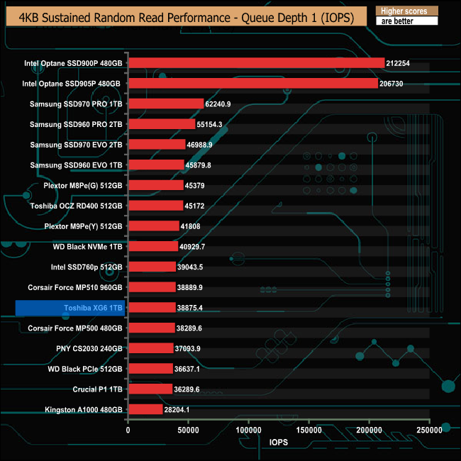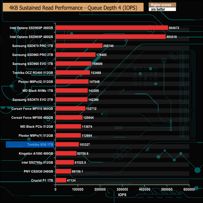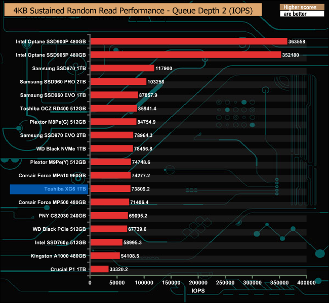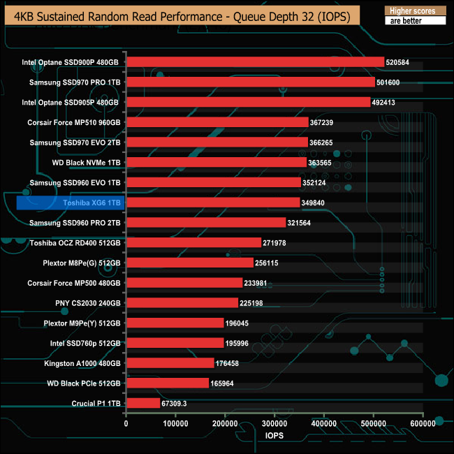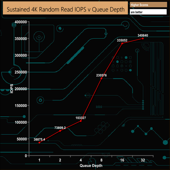 Toshiba quote a 4K random read performance figure of up to 355,000 IOPS for the XG6, a figure we fell just shy of under testing, the review drive producing a maximum of 349,840 IOPS.