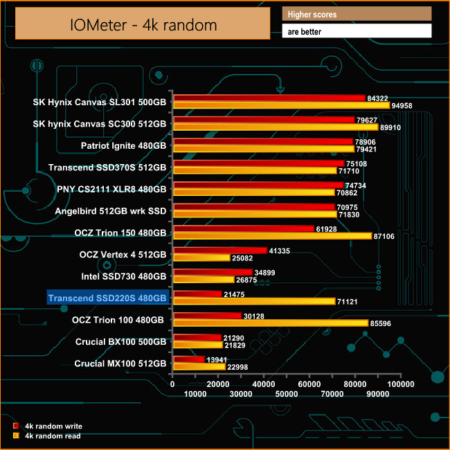 Transcend quote 4K IOPS performance figures for the SSD220S 480GB at up to 80,000 IOPS for both read and writes. Unfortunately the review drive failed to get anywhere near that figure for either. For reads the drive produced an IOPS figure of 71,121 IOPS while writes were a very disappointing 21,145 IOPS.