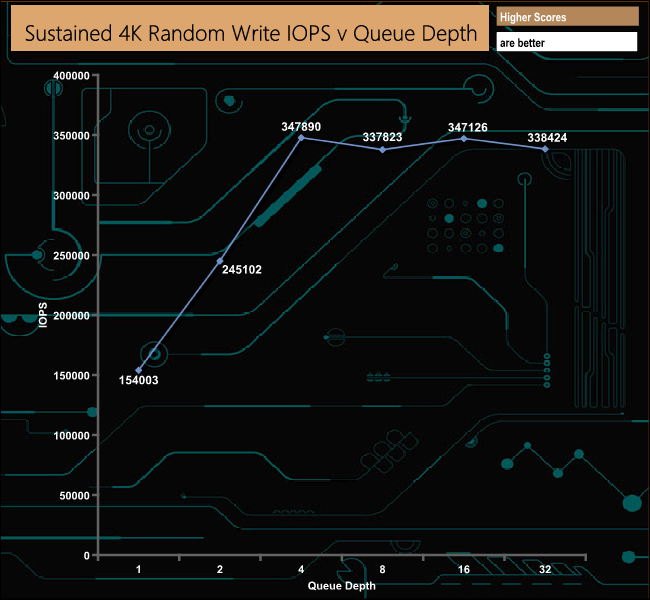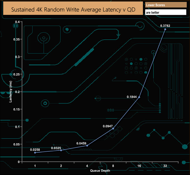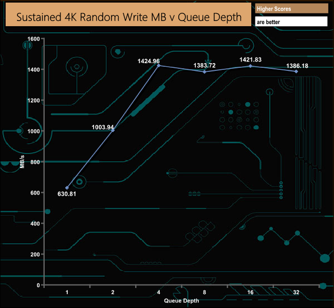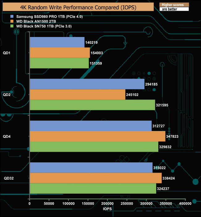 In our 4-threaded 4K random write tests, the only time the PCIe 4.0 Samsung SSD980 PRO has the upper hand over the AN1500 is at QD2. At this queue depth, the PCIe 3.0 WD Black SN750 outperforms both of the newer drives.