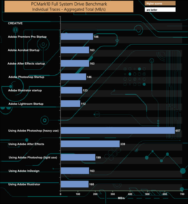 The two best performances in the creative group of test traces were the 657MB/s from the Adobe Photoshop heavy use test and the 339MB/s from the Adobe After Effects test.