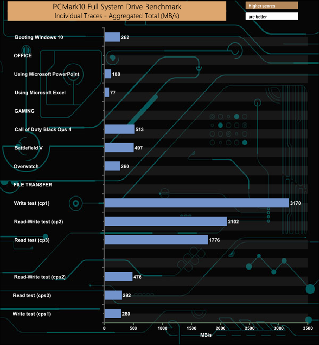 The PCMark 10 Full System Drive Benchmark uses a wide-ranging set of real-world traces from popular applications and common tasks to fully test the performance of the fastest modern drives. The benchmark is designed to measure the performance of fast system drives using the SATA bus at the low end and devices connected via PCI Express at the high end.
