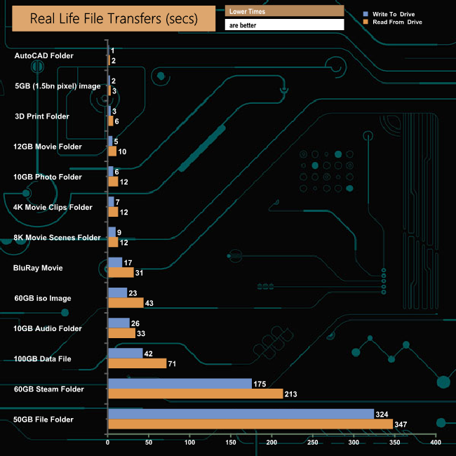 When transfering files to and from another NVMe drive, the AN1500 showed just how fast it can be with seven of the thirteen tests producing a write figure over 2GB/s with three (Blu-ray, 60GB iso image and 12GB movie folder) over 2.5GB/s.