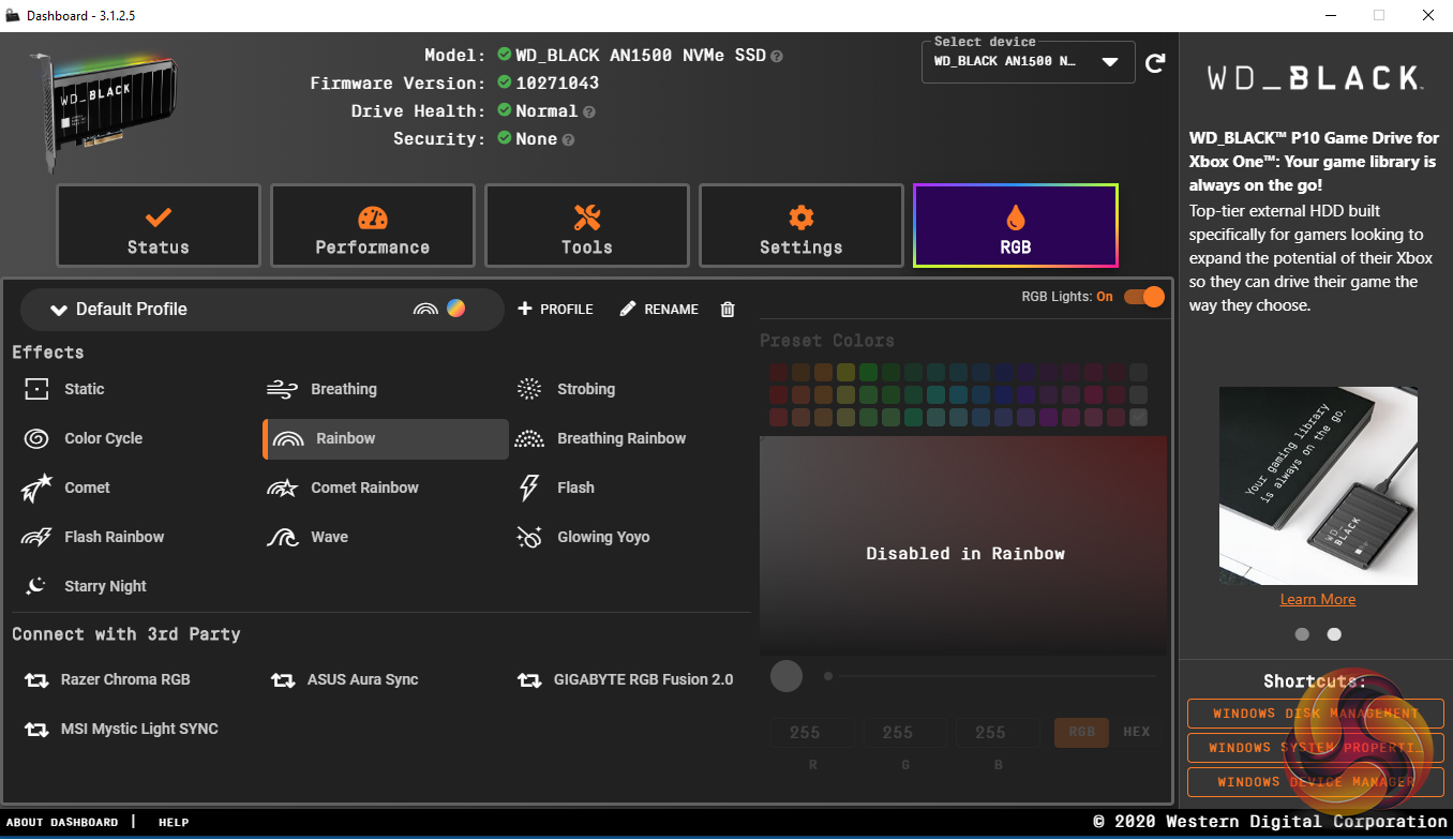 Then, of course, there is the control page for the RGB lighting system which has 13 basic pattern effects with options to tinker about with the colours being used. It is also compatible with the most common of the motherboard RGB systems out there; MSI's Mystic Light Sync, Asus' Aura Sync and Gigabyte's RGB Fusion.