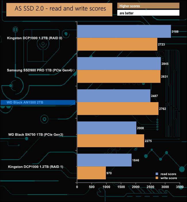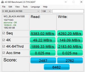 Although the AS-SSD benchmark read score of 2487 for the AN1500 is a fair bit slower than Samsung SSD980 PRO, the write score of 2762 is very much closer to the Samsung drive.