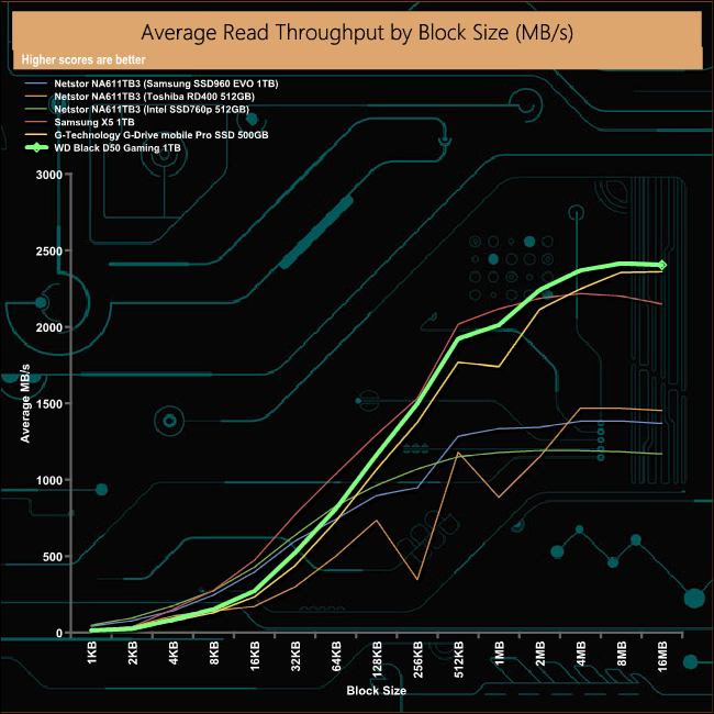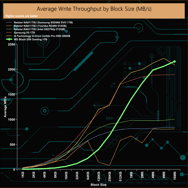 WD quote read speeds for the Black D50 of up to 3,000MB/s. In our throughput test, we couldn't hit that official maximum, the best we saw was 2,4158MB/s at the 8MB block mark.