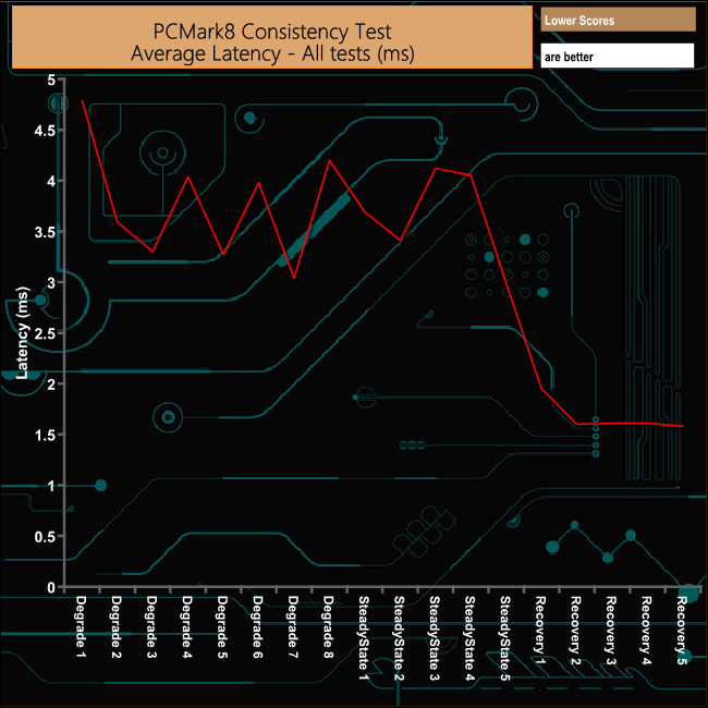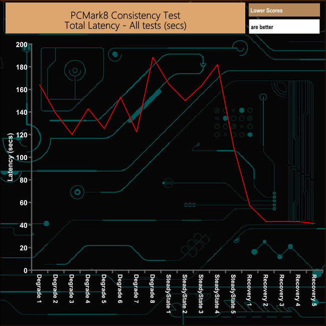 Futuremark’s PCMark 8 is a very good all round system benchmark but it’s Storage Consistency Test takes it to whole new level when testing SSD drives. It runs through four phases; Preconditioning, Degradation, Steady State, Recovery and finally Clean Up. During the Degradation, Steady State and Recovery phases it runs performance tests using the 10 software programs that form the backbone of PCMark 8; Adobe After Effects, Illustrator, InDesign, Photoshop Heavy and Photoshop Light, Microsoft Excel, PowerPoint, Word, Battlefield 3 and World of Warcraft. With some 18 phases of testing, this test can take many hours to run.