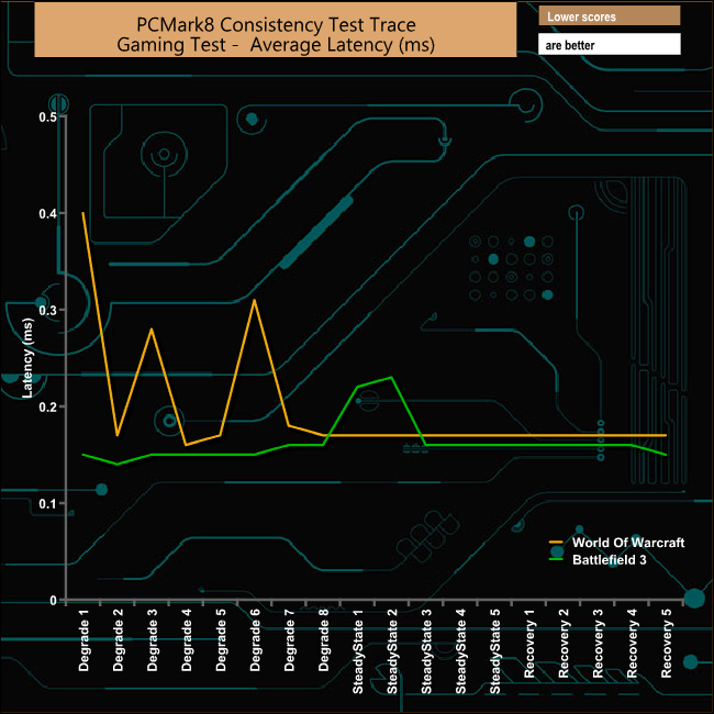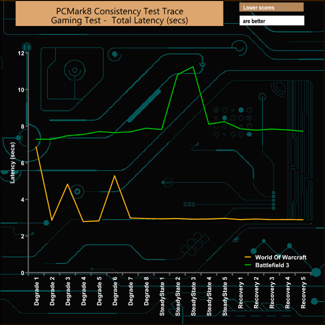 The drive was hit hard during the Degradation phases of the World Of Warcraft test, but after that the performance steadied throughout the Steady State and Recovery phases. The drive also suffered with the second and third Steady State phases during the Battlefield 3 test but recovered well from the ordeal.