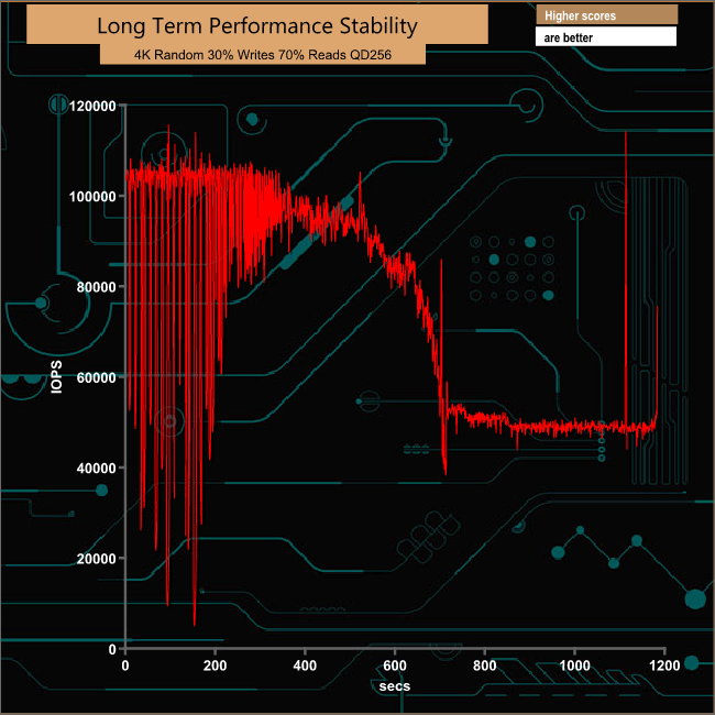 For the long term performance stability test, we set the drive up to run a 20-minute 4K random test with a 30% write/70% read split, at a queue depth of 256 over the entire disk. The 1TB WD Black NVMe averaged 75,539 IOPS for the test with a performance stability of 72%.