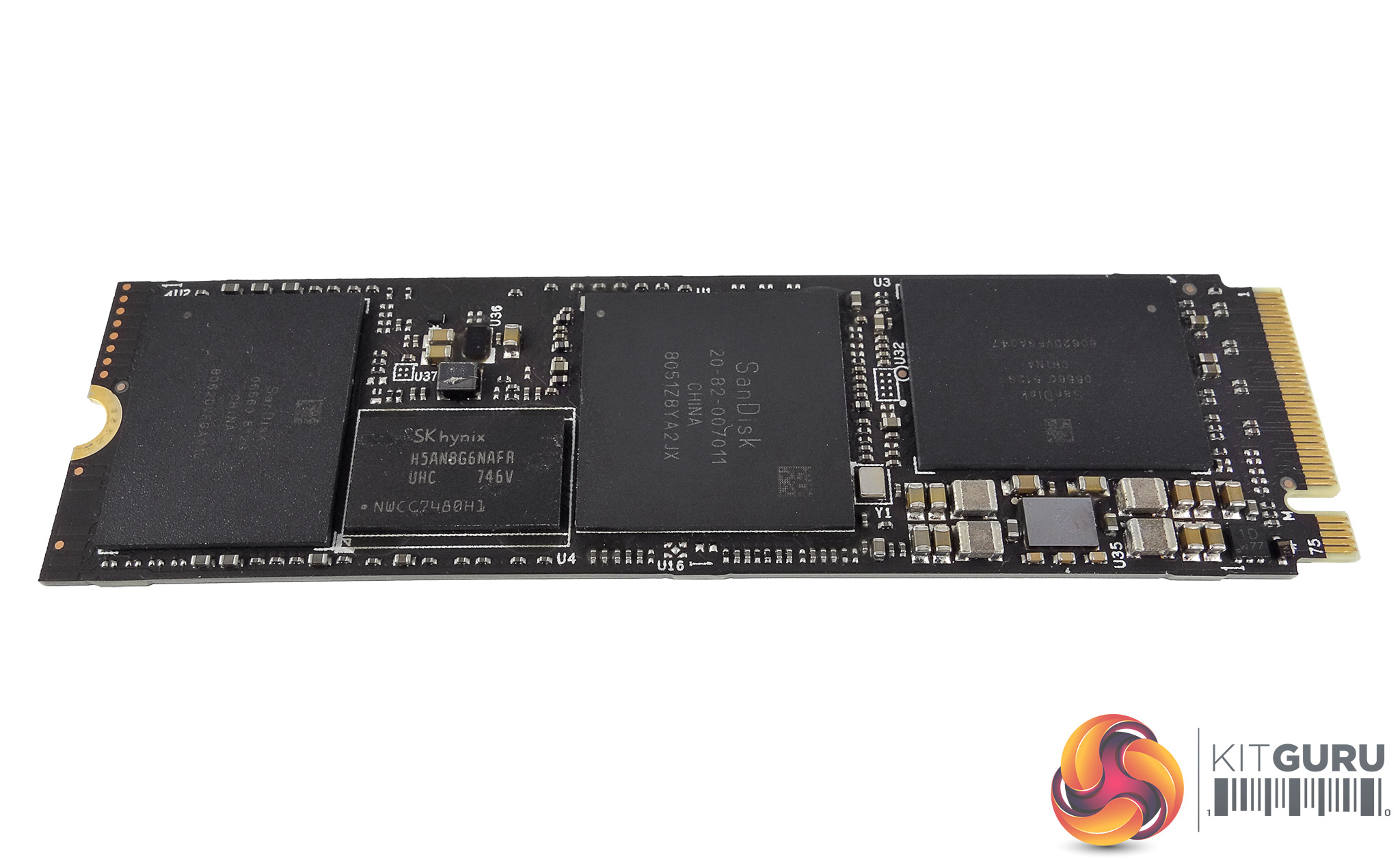 This 1TB drive uses two 512GB BiCS 3 64-layer TLC packages (labelled SanDisk 05560 512G). Sitting between one of these packages and the controller is a single SK hynix H5AN8G6NAFA 1024MB DDR4-2666 cache IC.