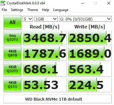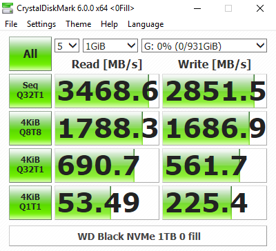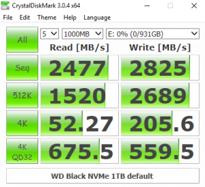 In CrystalDiskMark's 4K QD32 test the WD NVMe Black isn't quite as fast as Intel's latest SSD760p drive. At a QD of 1, though, the 4K Write performance is pretty good at 205.6MB/s. Comparing the default benchmark screen with the 0 fill test, it seems the new WD controller isn't concerned about the type of data it's being asked to handle.