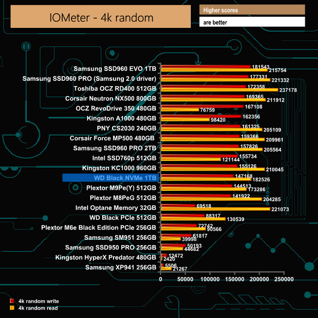The WD Black NVMe 1TB drive didn't get anywhere near the official figures in our original IOMeter 4K random tests, but once we ran our extended set of tests, the performance of the drive improved greatly.