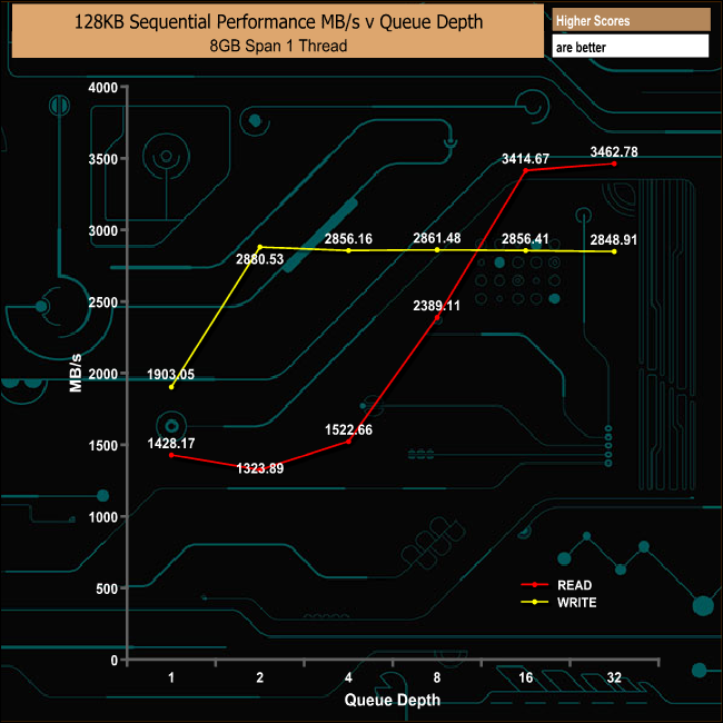 Testing the drive's sequential performance at varying queue depths saw the read performance increase with queue depth until it just surpassed the official maximum figure of 3,400MB/s at 3,462MB/s at a queue depth of 32. Writes, on the other hand, more or less peaked after the initial jump in performance between queue depths 1 & 2, with the peak coming at QD2 and a speed of 2,880MB/s.