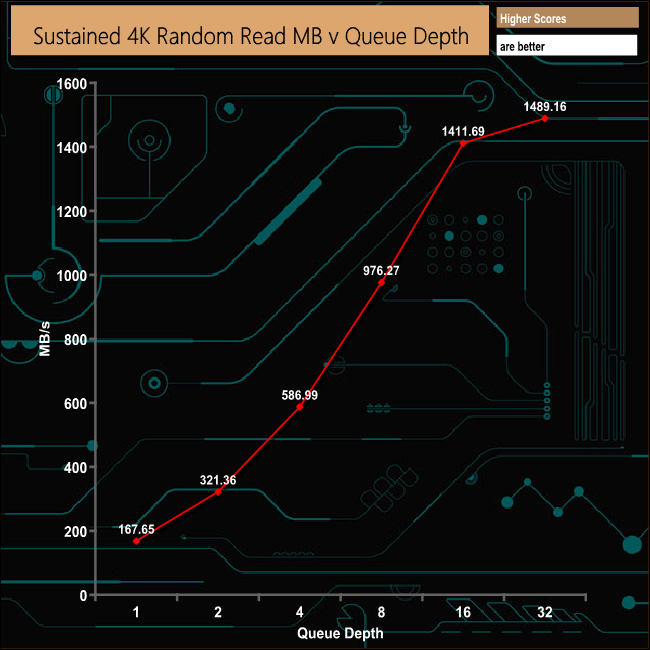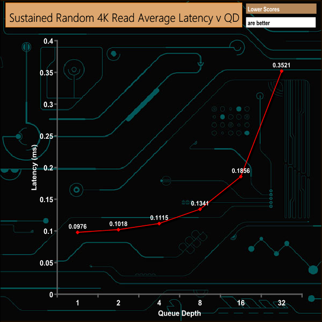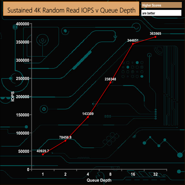 The official random read figure for the 1TB drive is up to 500,000 IOPS. Despite the fact that during our testing the drive couldn't match the official maximum speed, the tested figure of 363,565 IOPS makes the WD Black NVMe a very quick consumer drive regardless.