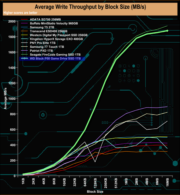 In our read throughput test, the WD Black P50 Game Drive peaked at 1,876.83MB/s at the 16MB block mark. Although this figure was shy of the official 2,000MB/s, it does make it the fastest non Thunderbolt drive we have seen to date.
