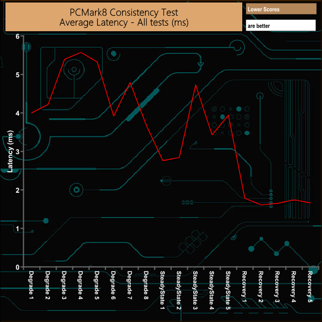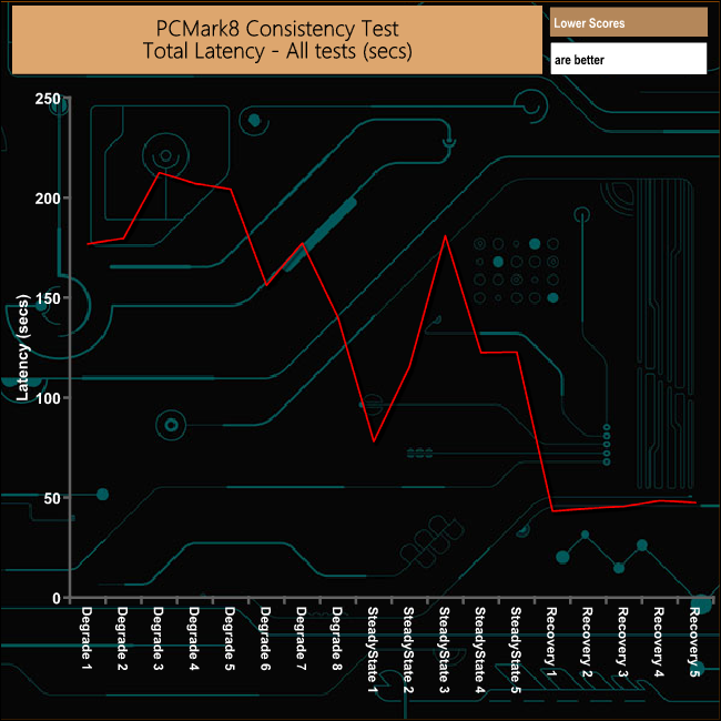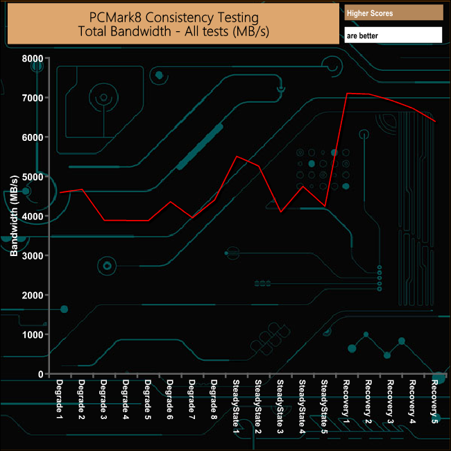 In PCMark8's Consistency Test, the drive does pretty well overall. It does get hit pretty hard during some of the Degradation and SteadyState tests but the overall recovery of the drive is good if a little erratic.