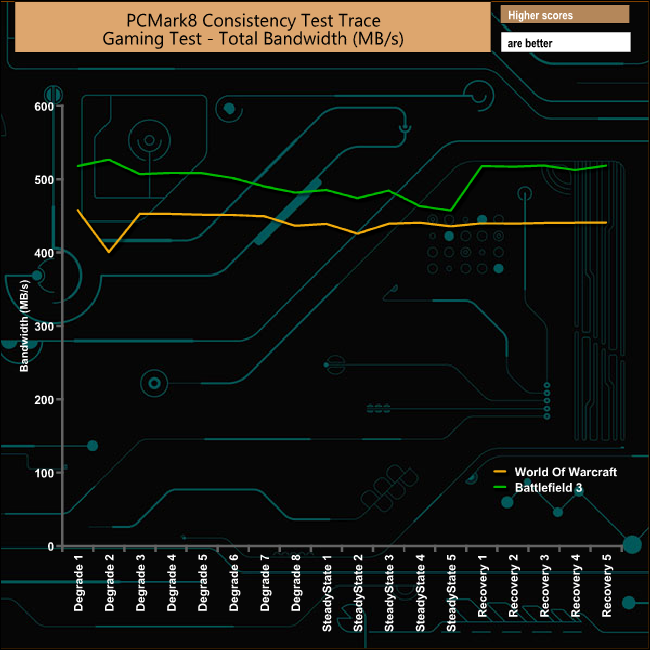 The drive handles the two casual gaming test traces very well with no sudden, dramatic dips in the test bandwidth for either test.