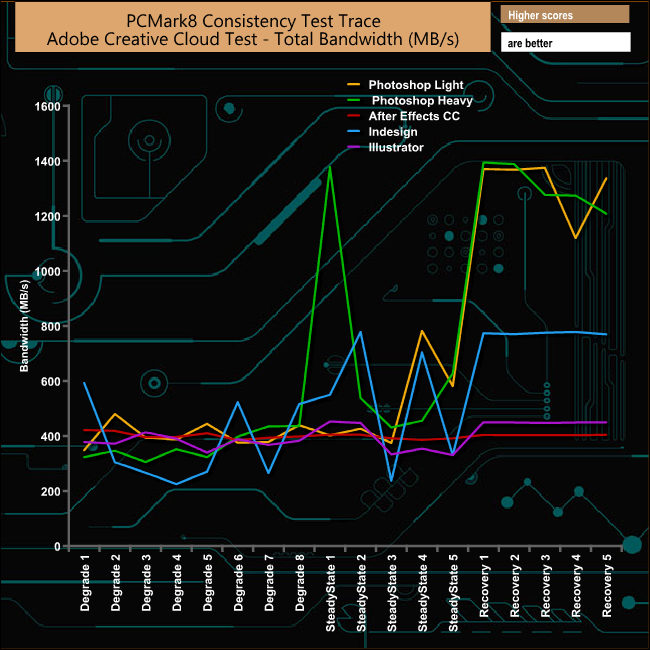 There's a huge peak in bandwidth as the drive enters the first SteadyState test run while running the Adobe Photoshop Heavy trace but it falls back again very quickly. The drive recovers pretty well if very erratically in both the Adobe Photoshop tests.
