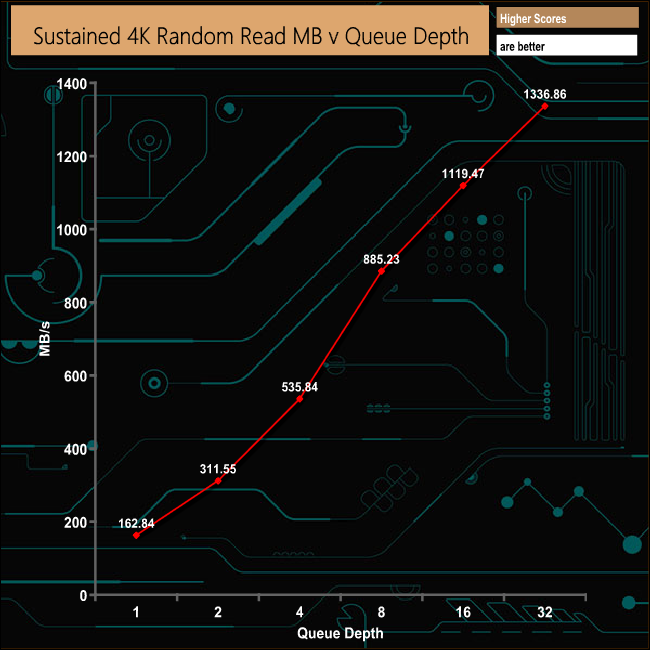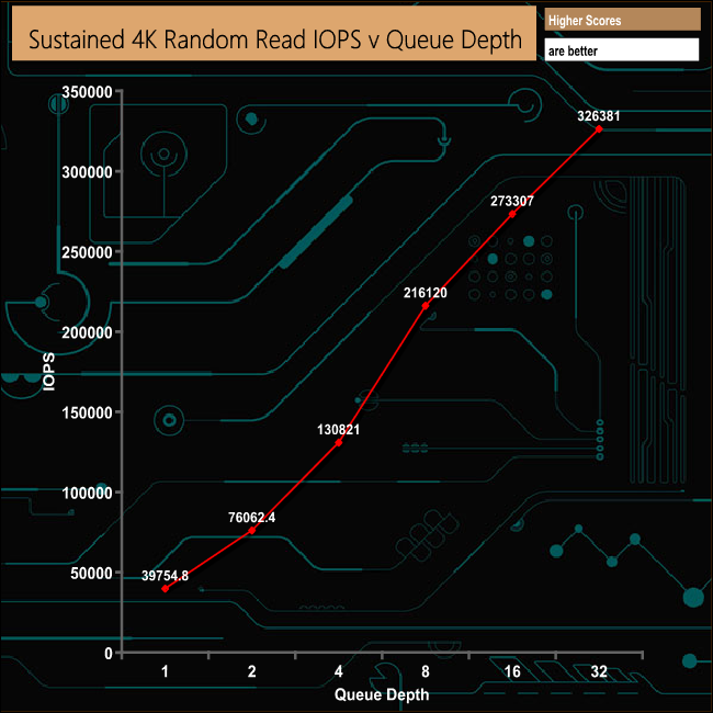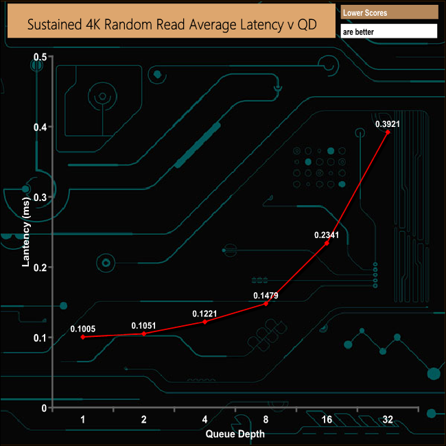 The official 4K random read figure for the 1TB SN750 is up to 515,000 IOPS. Under our tests the drive got nowhere near the official maximum figure. However the drive performs very smoothly as it climbs through the various queue depths.