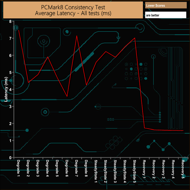 In PCMark8’s Consistency Test, the drive does pretty well overall. It does get hit pretty hard during some of the Degradation and SteadyState tests but the overall recovery of the drive is very good and pretty consistent.