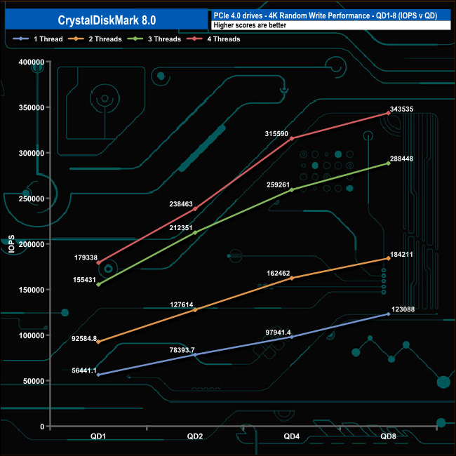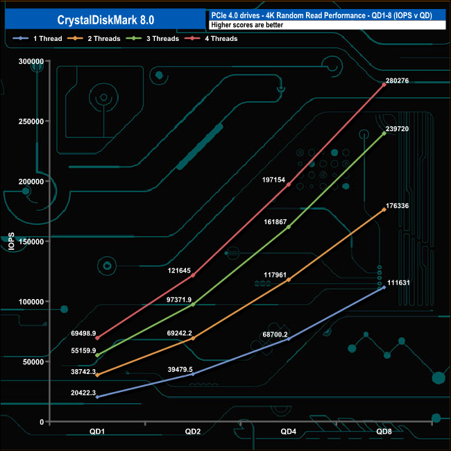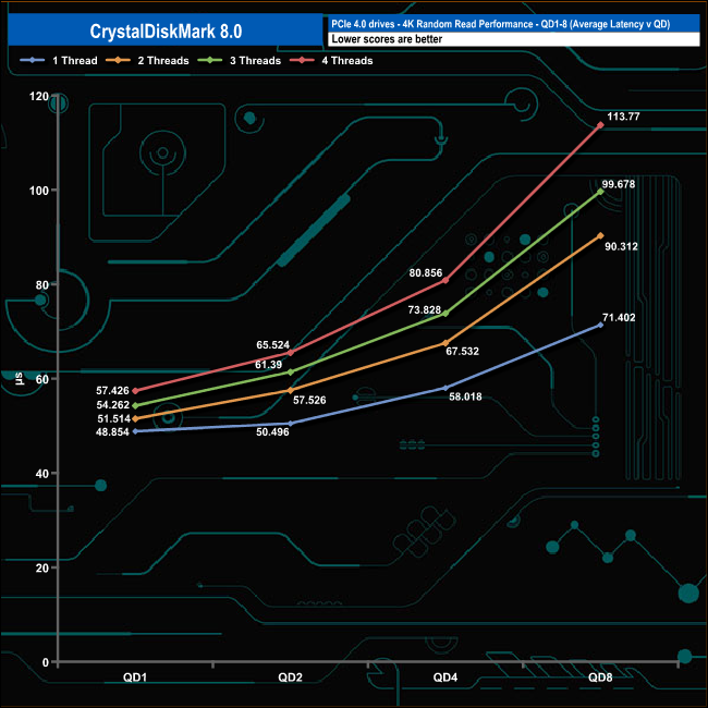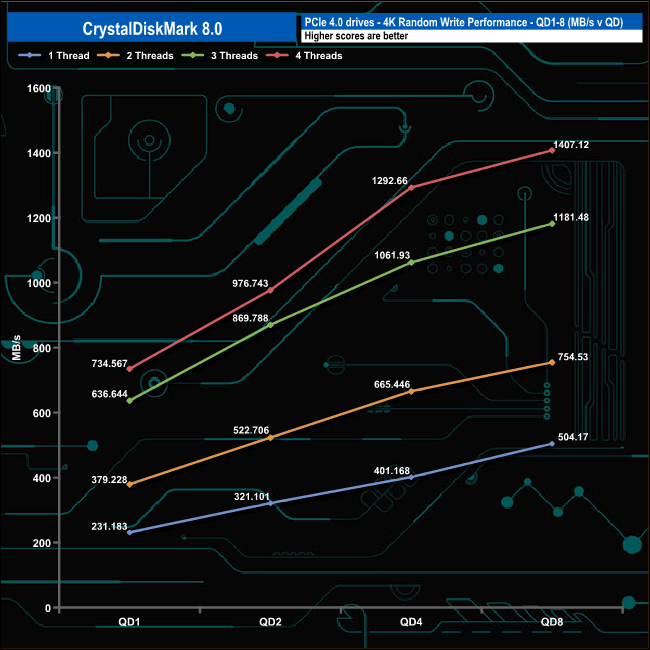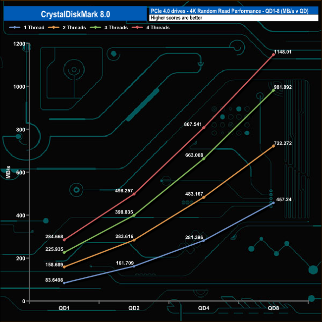 We used CrystalDiskMark 8 to test the random performance of the drive at lower queue depths (QD1 – QD8 where most of the everyday workloads occur) using 1 to 4 threads.